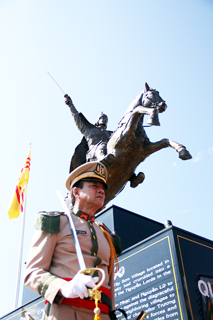 Noi gương Đại Đế Quang Trung, người SVSQ Trừ Bị Thủ Đức tuốt gươm đứng dưới chân tượng Vua Quang Trung vừa được quang khai. (Thanh Phong/ Viễn Đông)